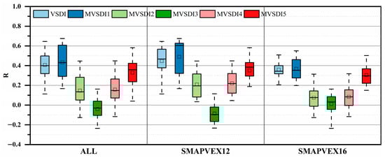 Figure 11 presents the comparisons between VSDI, modified VSDIs, and aircraft SM. An interesting phenomenon can be found in Figure 11 that the varied modifications in mathematical expression of VSDI do not improve the performance of VSDI. Specifically, MVSDI2, MVSDI3, MVSDI4, and MVSDI5 did not outperform the VSDI and MVSDI1 in the evaluations with SMAPVEX12 data, SMAPVEX16 data, and All experiments data. In contrast, MVSDI1 achieved better performance than the VSDI in the above evaluations. Notice that MVSDI1 and VSDI have the same mathematical expression while the former adds a sensitive band, i.e., SWIR1.