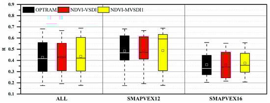 Box plots of Pearson’s R between the aircraft SM and the optical SM indexes during the whole study period in (a) all experiments, (b) the SMAPVEX12 experiment, (c) the SMAPVEX16 Manitoba experiment.