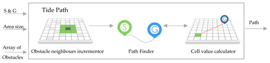 The environment (the world) is represented as a grid of discrete cells. The start and goal points, as well as obstacles, are generated randomly for each run. The TPP algorithm comprises three main components—obstacle neighbors incrementor, path finder, and cell value calculator—as shown in Figure 2. Each component implements part of the TPP algorithm, as shown in Figure 3.