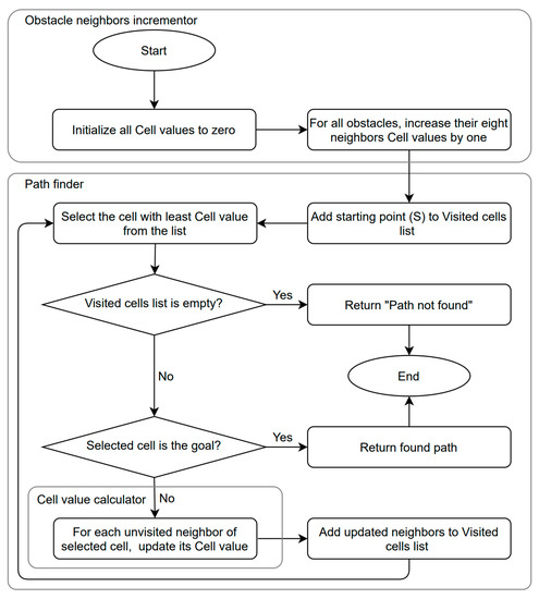 Then, the path finder searches for an optimal path from the start to the goal. It maintains a list of visited cells and starts by designating the starting point as the current cell. While the list is not empty, the visited cell with the minimum cost will be checked for whether it is the goal point. If this is true, then the sequence of cells visited from the starting point to the current point will be returned as the final path. Otherwise (i.e., if the currently selected cell is not the goal), then the cell value calculator will update the cell value of all unvisited neighbors of the current cell.