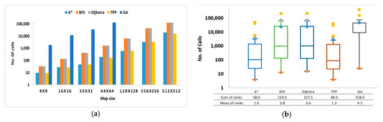 To gain more explicit understanding of the algorithms’ behavior overall in the trials, the results distributions were visualized using the boxplots in Figure 4b. The figure shows that the number of visited cells in both the TPP and A* algorithms is less dispersed than in the BFS and Dijkstra algorithms. Additionally, the TPP and A* algorithms also have lower minimum and maximum values, which indicates that their numbers of visited cells are generally lower than the other algorithms. When comparing the TPP to the A* plots, they look similar in distribution and in minimum and maximum values; however, in the TPP plot, the median—represented by the horizontal line in the box—is not in the middle of the box, which indicates that the results are skewed to the smaller values. Hence, the number of visited cells tends to be lower in the TPP algorithm. GA displays the highest minimum and maximum values with the least distribution as, in all scenarios, the algorithm visited significantly more cells to find a shortest path or failed to find one.