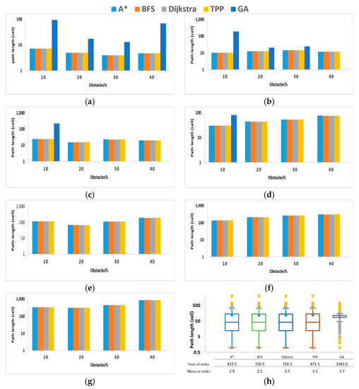As the obstacle ratio increases from 10 to 40%, the path length of each algorithm is illustrated in Figure 7a–g. The figure shows that the BFS, Dijkstra, A*, and TPP algorithms demonstrate identical path lengths in all runs, regardless of the obstacle ratio. However, the GA could not find the shortest path in large maps (i.e., it was intractable in maps larger than 8 × 8 with high obstacle ratios) (Figure 7b–d) and in maps larger than 64 × 64 (Figure 7e–g), even with lower obstacle ratios.