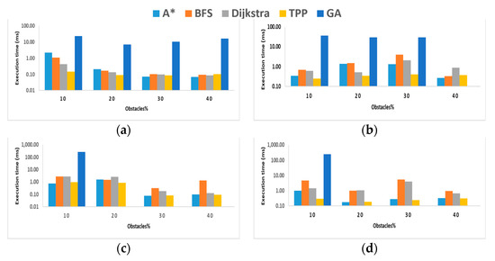 The TPP and A* algorithms showed identical behavior, outperforming the BFS and Dijkstra algorithms, which also showed identical behavior across all trials. The GA presented the least performance and failed to find a path in large maps, as evident in Figure 5e–g, where the GA was intractable in maps larger than 64 × 64. Additionally, although increasing the obstacle ratio does not show a clear effect on the performance of the other algorithms, it negatively affected the GA’s performance. In maps greater than 8 × 8 (Figure 5b–d), as the obstacle ratio increased, the GA could not find the shortest path. Moreover, even for small maps with a small number of obstacles, the GA visited significantly more cells than the other algorithms. Its behavior was inconsistent, i.e., the time required to find the path varied greatly between the different trials due to the randomness involved in the design of this algorithm.
