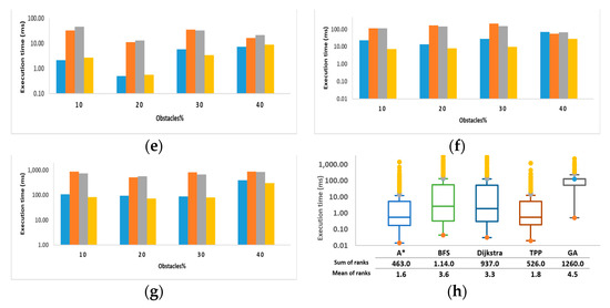 The execution time result distributions are shown in the boxplots in Figure 9h. Similar to the number of visited cells, the TPP algorithm’s execution time has a better statistical distribution, which is close to the A* algorithm but better than the BFS, Dijkstra, and GA. Furthermore, the TPP algorithm and GA show the lowest minimum and maximum values with positively skewed medians, indicating lower execution times. Again, as the GA was intractable in many scenarios and failed to find a path, its distribution is the worst and shows the highest minimum and maximum values.