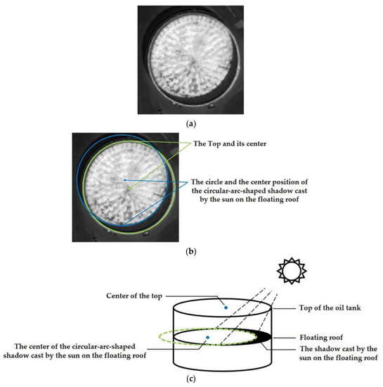 Figure 1. Structural diagram of floating roof oil tank. (a) Original image; (b) top of oil tank and circle of circular arc on the floating roof; (c) three-dimensional structure of floating roof oil tank.