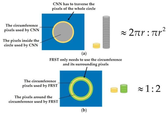 Figure 2. Comparison of the number of pixels traversed by CNN and FRST to process circular objects. (a) Comparison of the number of pixels traversed by CNN in processing circular objects; (b) comparison of the number of pixels traversed by FRST in processing circular objects
