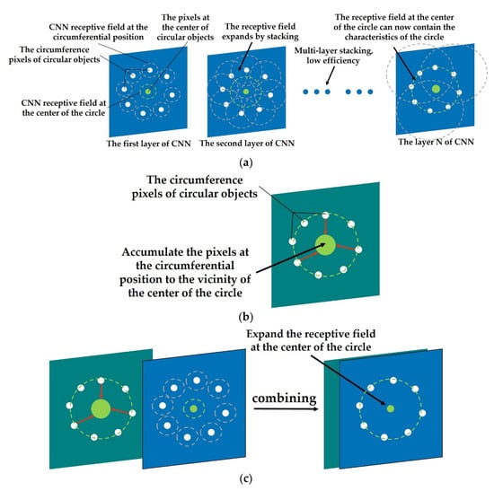 Figure 3. Schematic diagram of CNN, FGMRST/FRST, and dual-channel method applied to circular objects. (a) CNN applied to circular objects; (b) FGMRST/FRST applied to circular objects; (c) dual-channel method applied to circular objects.