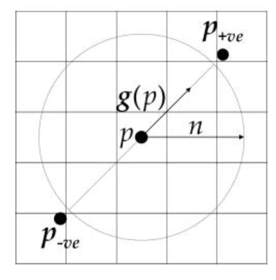 Firstly, the positively affected pixels and the negatively affected pixels are defined: for pixel p, the positively affected pixel is defined as the pixel that the gradient vector g(p) is pointing to, a distance n away from p, and the negatively affected pixel is the pixel a distance n away that the gradient is pointing directly away from.