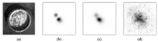 Comparing Figure 10b,c with Figure 7b,c, it can be found that FGMRST can better extract and distinguish the two circle centers. However, the final symmetry map is produced after combining all radial symmetry images [27]. Thus, different radii information is accumulated in the output of the transform [27]. As long as the value of input radius is a range rather than a single value, the number of pixels at certain locations and specific radii that contribute to the projection matrices is not possible to be evaluated, thus the purpose of accurately localizing the circle center and determining the radius cannot be achieved.