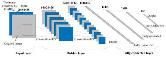 This study designed three CNN structures. The first CNN is named net_conv2, whose structure model is shown in Figure 13. It is divided into three parts: the input layer, hidden layer, and output layer. The input layer is the input sample data. The hidden layer is the key part of CNN, including two convolutional layers and two batch normalization (BN) layers. The convolutional layer is composed of a filter layer, a spatial sampling layer, and a nonlinear layer. The nonlinear layer is realized by the RELU activation function. Considering that the sampling position of the pixels for the max pooling will affect the accurate localization of the oil tank, the sampling is realized by setting the stride of two convolutional layers to 2 instead of adding the pooling layer. The output layer is a fully connected layer, which is designed as a three-layer perceptron, and the number of output features of each layer is 120, 84, and 5, respectively. After the samples are input into CNN, the hidden layer is used for feature extraction, and then the fully connected layer is used to predict the related parameters. The second CNN is named net_conv3, which adds a convolutional layer and a BN layer after the second BN layer of net_conv2, and the others remain unchanged. The structure model is shown in Figure 14. The third CNN is named net_alex because it is modified from AlexNet [16]. Its structure model is shown in Figure 15. It is also divided into three parts: input layer, hidden layer, and output layer. The hidden layer contains five convolutional layers. The convolutional layer is also composed of a filter layer, a spatial sampling layer, and a nonlinear layer. The nonlinear layer is realized by the RELU activation function. Considering that the sampling position of the pixels for the max pooling affects the accurate localization of the oil tank, the sampling is realized by setting the stride of five convolutional layers as 2, 2, 1, 2, and 2, respectively, instead of adding the pooling layer. The output layer is a fully connected layer, which is designed as a two-layer perceptron, and the number of output features of each layer is 1024 and 5, respectively.
