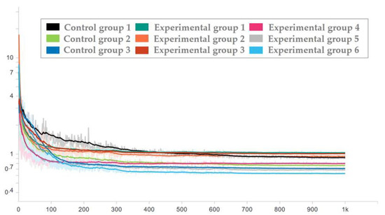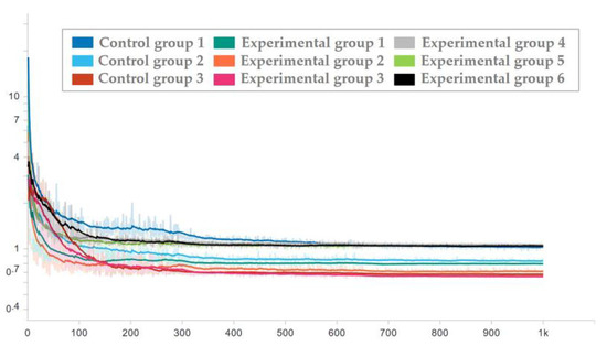 To ensure the effectiveness of the network used in the test set, the network corresponding to each epoch in the training process was applied to the test set, and the loss trend diagram of the test set is drawn as shown in Figure 16 and Figure 17. To ensure the display effect, the y-axis was logarithmic and smoothed, and the smoothing coefficient was set to 0.95.