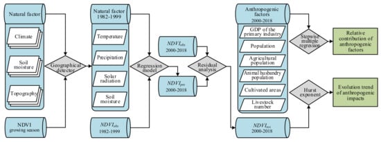 | NDVI | 15 d/1/12° | 1982–2015 | Global Inventory Modeling and Mapping Studies (GIMMS) (https://ecocast.arc.nasa.gov/, accessed on 1 November 2019) | Geographical detector modeling and residual analysis. |