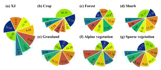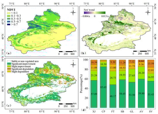 - From 1982 to 2018, the overall trend of vegetation in Xinjiang gradually improved, and the vegetation dynamics mainly significantly improved (57.09% of the vegetated areas). The changes to all the vegetation types showed a greening trend, especially for crops.