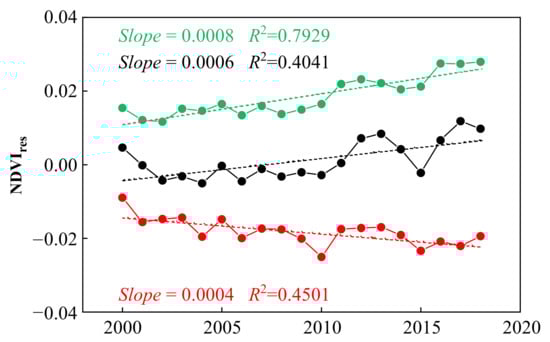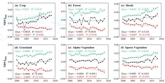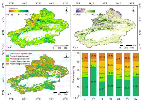 - From 2000 to 2018, the anthropogenic effects of vegetation changes in Xinjiang mainly included positive impact increases. Human activities promoted the continuous increase in the NDVI of various vegetation types, especially crops, shrubs, and sparse vegetation. Both the positive and negative impacts of human activities increased over the study period, and the growth rate of the positive influence was higher than that of the negative influence.