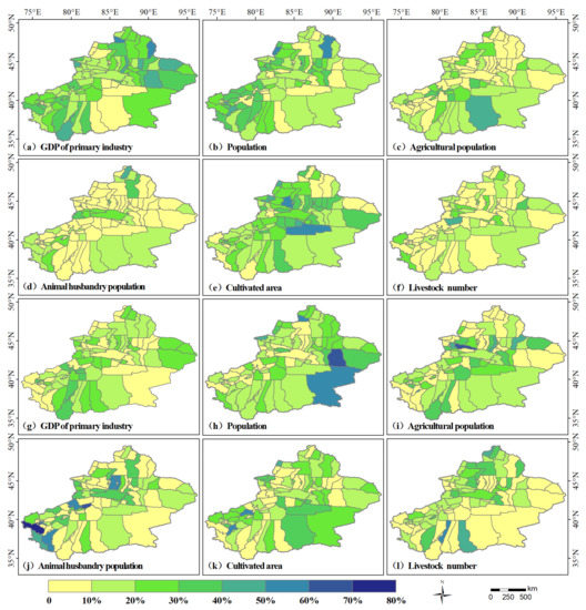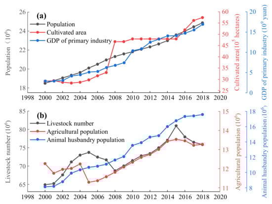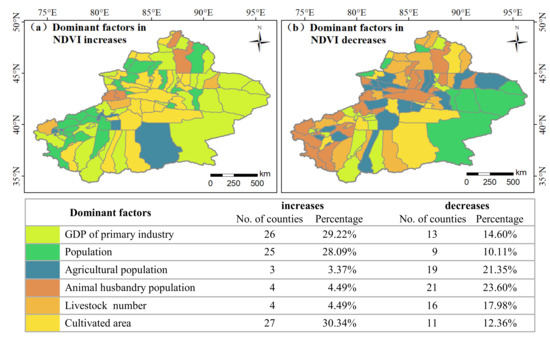 - The cultivated area, GDP of primary industry, and population are the main anthropogenic factors driving the increase in vegetation NDVI, especially the cultivated area, which dominated the increase in NDVI in 30.34% of the counties. The livestock number, agricultural population, and animal husbandry population are the main anthropogenic factors driving the decrease in NDVI, especially the animal husbandry population, which dominated the decrease in NDVI in 23.60% of the counties.
