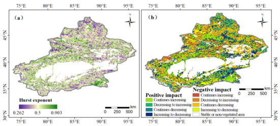 - The evolutionary trend of the anthropogenic impact on vegetation dynamics in Xinjiang will be dominated by anti-persistence, thereby mainly showing that the positive impacts continued to increase. The evolutionary trend of anthropogenic influences on crops, shrubs, grasslands, and alpine vegetation mainly show that positive impacts will continue to increase, while forests and sparse vegetation will mainly experience increasing-to-decreasing positive impacts.