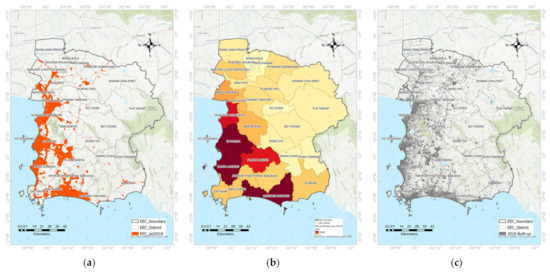 Furthermore, the lit area was extracted using the thresholding method to differentiate each district’s dark and bright areas. The threshold value was calculated for each year from 2012 to 2018 from the annual mean composite of VIIRS dataset by applying Otsu’s method. The threshold of the lit area was found to be between 19.25 to 20.93 . The samples of built-up area, sum of light intensity, and area of lit maps extracted from remotely sensed data are presented in Figure 3.