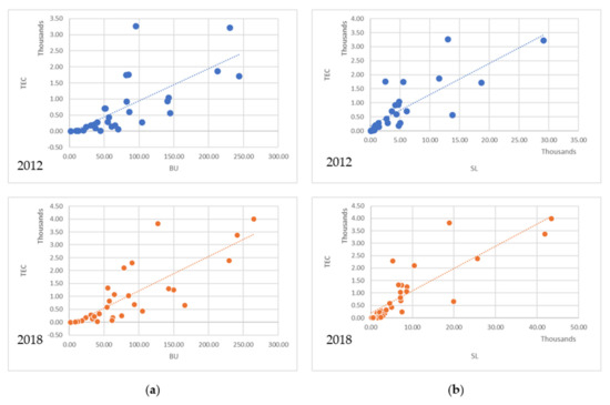 The scatter plot and correlation between predictors and prediction variable (sample of the year 2012 and 2018); (a) TEC and BU and (b) TEC and SL.