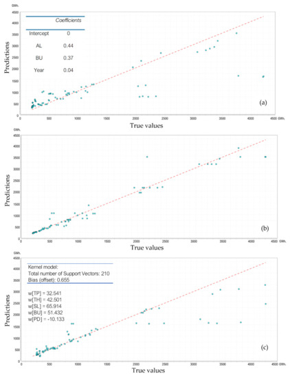 The MR model is presented in Equation (9). The variables, including AL, BU, and area, were selected from the feature selection method. The MR model provided the lowest accuracy compared to DT and SVR (see Table 4).
