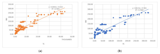 The correlation between geographical variables (remotely sensed data extraction); (a) BU and SL; (b) BU and AL.