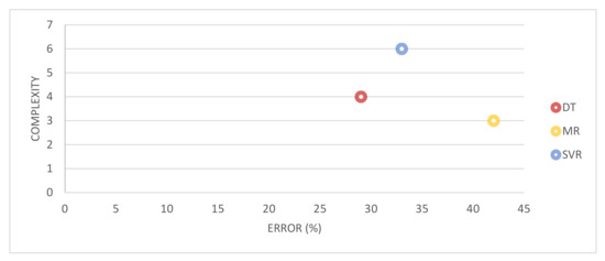 The regression method in machine learning may be challenged by the complexity of predictor variables, which could generate a high bias model. The increasing complexity is possibly caused by the decreasing of model accuracy. Thus, we need to optimize both complexity and accuracy, avoiding a more complex and over-fitting model. Figure 7 compares the trade-off between the model complexity and the error rate of MR, DT, and SVR models.
