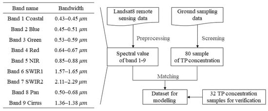 The spectral values of nine bands of Landsat8 remote sensing data were extracted, including coastal band, three visible bands, near-infrared band, two short-wave infrared bands, panchromatic band, and Cirrus band (Figure 2). After the spatial overlaying for the ground sampling data and 9 bands data of Landsat8 remote sensing images, the data set for modeling was extracted from the 9 bands in 80 points corresponding to the ground sampling points. Among these, the spectral value of nine bands was taken as the input training data, while the ground sample data of TP concentration were taken as the target output data. Finally, the retrieval model of TP concentration was built based on the data set for modeling.