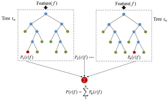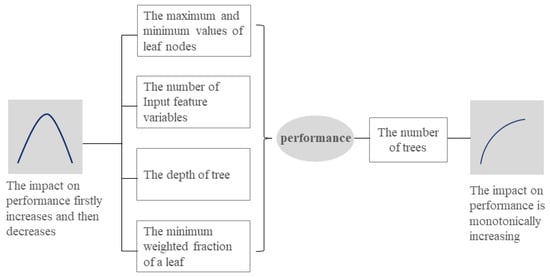 As for the hyper-parameters, the more the number of random decision trees, the better the model performance. The influence of the number of leaf nodes and feature number on the algorithm performance will increase first and then decrease (Figure 4) [58]. Through repeated testing, a set of appropriate hyper-parameters is set for the algorithm. The number of trees was 125, and the maximum depth of the tree was set as 25 to improve the efficiency of the operation, while the rest of the parameters took default values.
