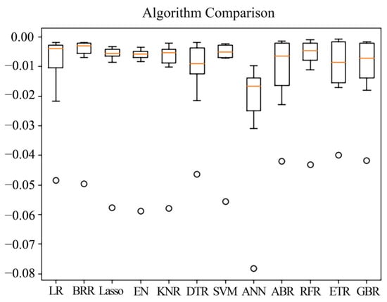 The machine learning algorithms were very sensitive to the input data set; thus, this study firstly analyzed the model performance by the mean squared error (MSE) regression loss based on the input data set and the K-fold cross-validation [37]. The 10-fold cross-validation was used to evaluate the accuracy of 12 machine learning algorithms. It divides the sample data set into 10 subsets, 9 of them were taken as the training data, and the remaining 1 was taken as the testing data. After 10 rounds of modeling, the average error was calculated to evaluate the accuracy of these models [38]. It can avoid using the same experimental data to test the model and represent the average accuracy of the retrieval model of TP concentration. As seen from Figure 5, the negative value of MSE was used as the evaluation criterion in Scikit-learn. The distribution of MSE of two algorithms of ETR and GBR were relatively centralized, with a small gap between the upper and lower limits. The median value was around 0.01, which was close to the middle part, indicating that the distribution of MSE was relatively stable and had suitable performance. It should be considered as the key modeling algorithm. In addition, the rationality of the ABR and DTR algorithms was also higher than other algorithms. The abnormal value of the ANN algorithm was extremely large, and its gap between the upper and lower limits was also large; thus, the ANN algorithm was not ideal for retrievals of TP concentration.