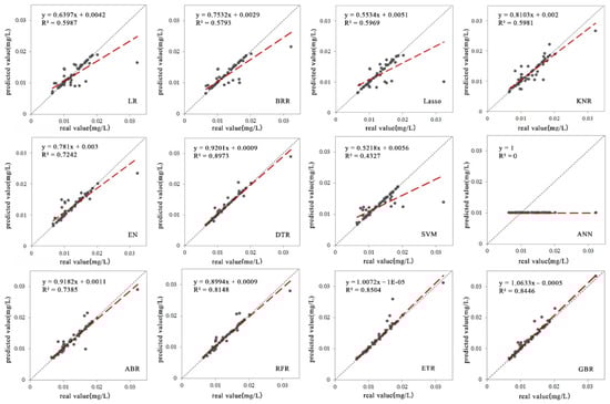 This study also used the mean absolute error (MAE), the mean square error (MSE), the explained variance score, and the determination coefficient (R2) to assess the model performance (Table 2). Moreover, the comparison of the ground monitoring data and the corresponding modeling results were offered in Figure 6 to visualize the model fit. As it was seen from Figure 6, the worst performance was obtained with the ANN model. The fitting curve was approximately a straight line indicating that the single-layer network model was not applicable to the sample data and it was not sensitive to the TP concentration obtained from the field. Comparatively speaking, the models of Lasso, LR, KNR, BRR, and SVM algorithms can achieve a certain degree of fitting, while the models of DTR, ETR, GBR algorithms obtained the maximum fitting values for the input original data set (Figure 6 and Table 2).