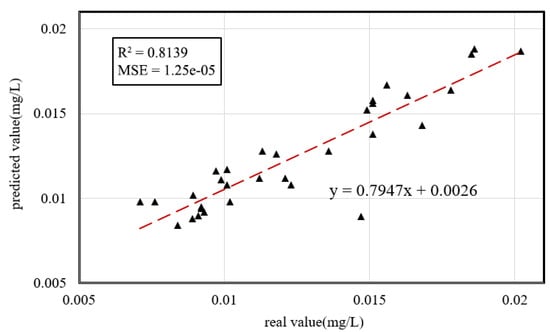 To further validate the accuracy and stability of the retrieval model for the TP concentration, this study used the ground monitoring data of TP concentration in another 32 sampling points, which were not included in the modeling sample, to verify the accuracy of the model. The results showed that the retrieval model based on the ETR algorithm had great accuracy with R2 of 0.813927, MSE of 0.0000125. The fitting scatter plot was shown in Figure 7, which also indicated that the ETR algorithm can accurately achieve the retrieval for the TP concentration.