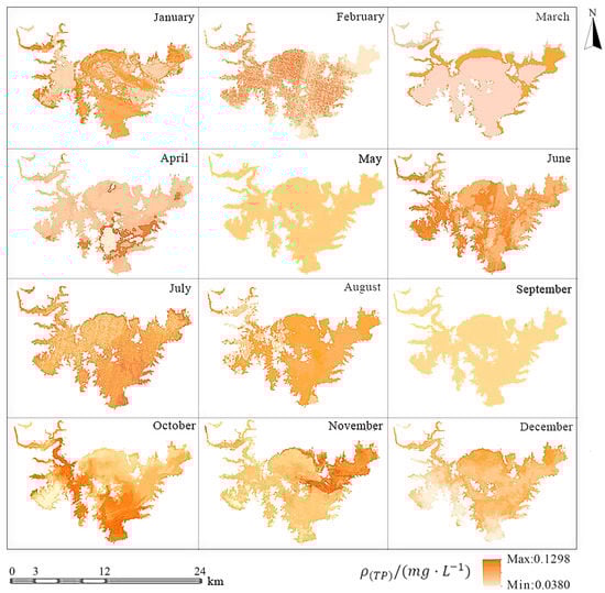 According to the equal interval classification, the standard limit value of TP concentration was divided into 12 categories, namely II-1, II-2, II-3, II-4, III-1, III-2, III-3, III-4, IV-1, IV-2, IV-3, and IV-4. According to the TP concentration amounts obtained in this study, the reclassification of the data was grouped into eight classes. The classification results of the TP concentration in the Miyun Reservoir were offered in Figure 9 on a monthly basis.