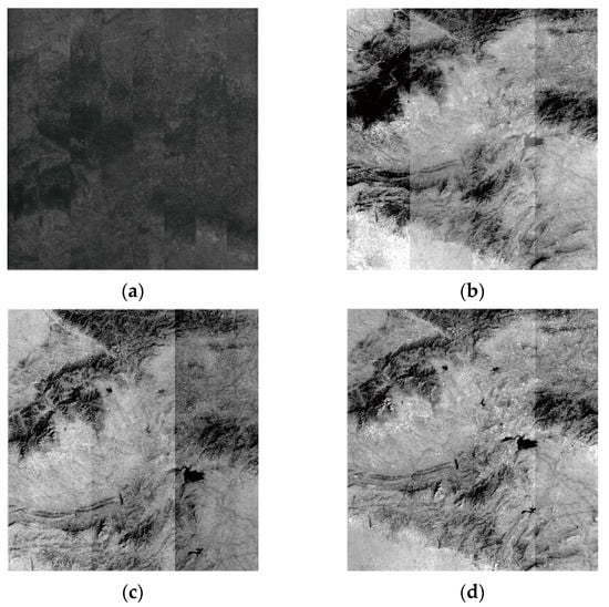 To evaluate the stitching accuracy more intuitively, the roads and buildings at the stitching seams are intercepted as obvious features, and the continuity of these features is judged by the visual evaluation method. The magnified images are shown in Figure 8e–h. As shown by the magnified image, there is no misalignment in the visual inspection, and the panoramic stitching image meets the accuracy requirement of visual seamlessness.
