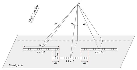 The mounting relationship is introduced with three TDI CCDs as an example, as shown in Figure 3. The TDI CCDs are staggered in the focal plane with each slice length w pixels, spaced by dy pixels along the track direction, and overlapping dx pixels in the vertical track direction. The original multi-slice images are obtained by pushing and scanning along the flight direction.