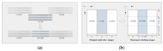 Acquired directly from three TDI CCDs that are strictly co-linear in the focal plane, the panoramic stitching image keeps the position of the odd slice image unchanged and embeds the even slice image between the odd slice images. As shown in Figure 4a, VCCD2 is the part of the even slice image CCD2 converted to the panoramic stitching image. With the reference of the odd slice image and the even slice image embedded, the imaging geometry of the original slice image maintains to the maximum extent to prevent the stretching deformation of the left and right edges of the panoramic stitching image. In addition, setting the stitching line at the right border of the CCD1 image and the left border of the CCD3 image preserves the odd-slice image information.