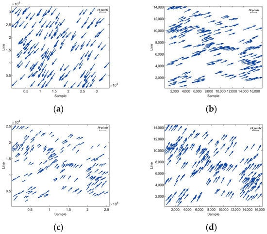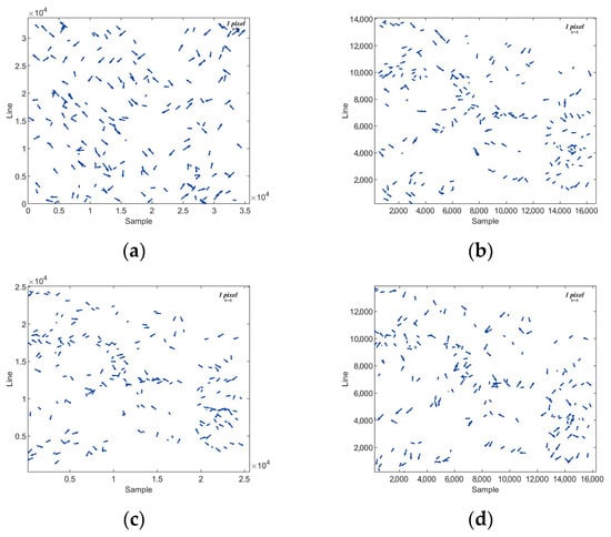 Discrepancies in the image space using bias-corrected RFM. (a) Data A; (b) Data B Forward; (c) Data B Nadir; (d) Data B Backward.