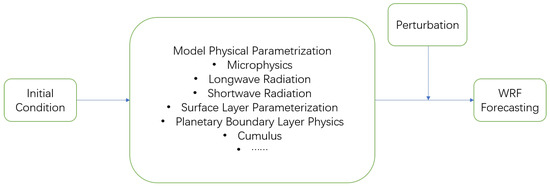The scheme of SPPT is on the basis of the assumption that the parameterized physics tendencies have uncertainties [28,30,37], as mentioned in Section 1. Therefore, a presentation of model uncertainty was prepared by perturbing the parameterized accumulated physical tendencies of four different variables, wind tendency (u and v), temperature tendency (T), and relative humidity tendency (), at each time step. The workflow is represented in Figure 3.