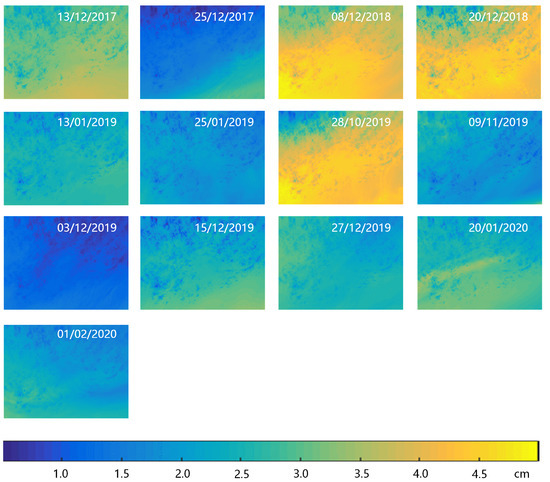 According to Figure 4 and Figure 5, the value of IWV is at the centimeter level and the value of ZHD is at the meter level; thus, the hydrostatic component takes up most of the tropospheric delay for a single acquisition. However, the wet delay varies with time more frequently than the hydrostatic delay. We calculated the average values of ZHD and ZWD with the of 6.2 according to Equation (7); these are listed in Table 3 below. For instance, the difference in ZWD on 28 October 2019 and 9 November 2019 is about 12 cm. However, the ZHD on different acquisition dates are nearly equal. We compared the ensemble mean of IWV with the value of the WRF simulation without SPPT on each date, as shown in Figure 6. The difference between the mean of the WRF-SPPT ensemble forecasting and the WRF-only results varied from −0.5615 to 0.4223 cm, equaling −3.4813 to 2.6183 cm for the ZWD considering the factor of .