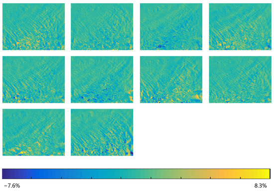 The linear deformation rates achieved by stacking with original interferograms, or with interferograms corrected by WRF-only simulation or WRF-SPPT ensemble forecasting are calculated, respectively, in Section 3.2. The SBAS technique is based on the least squares method and spatial filtering. The reliability and accuracy have been confirmed when SBAS is utilized to monitor the surface subsidence [41]. Assuming that the surface subsidence in the approach of SBAS is the reference deformation rate during the experimental period, we computed the deviations among the deformation rate of stacking with original interferograms and the rate of SBAS; the rate of stacking with the WRF-only scheme, and the rate of SBAS and the rate with WRF-SPPT and SBAS, respectively. The root mean square error (RMSE) is defined as