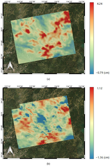 Taking advantage of the ZWD and ZHD in Section 2.2, the stacking method can be modified with atmospheric phase correction. The process of forecasting started nearly 16 h before the time of SAR acquisition each day. Then, the respective was produced utilizing Equations (4) and (5). Equation (14) was used to obtain the average deformation rate after atmospheric correction.