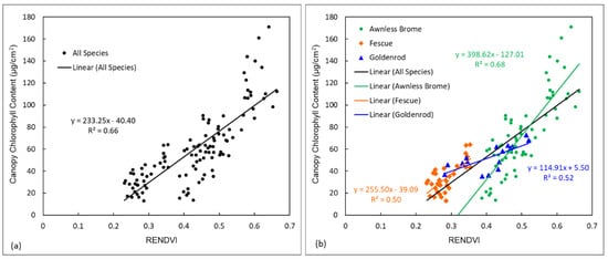 Figure 4. Scatter plots showing linear distribution patterns of canopy chlorophyll content versus RENDVI for three dominant species. (a) shows data of all species together and (b) shows three species separately.