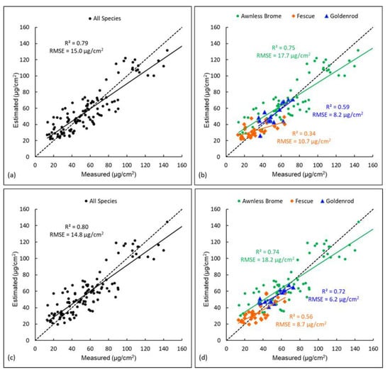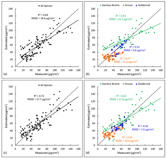 Species-specific LR models were validated, and the results are shown in Figure 5d. Compared to the accuracies of the universal LR model (Figure 5b), it can be found that the accuracies of Awnless Brome were close (e.g., R2 = 0.62 and RMSE = 21.8 µg/cm2 for the species-specific model versus R2 = 0.63 and RMSE = 22.3 µg/cm2 for the universal model). This is because, as discussed previously, Awnless Brome with most samples dominated the data distribution. However, the accuracies for Goldenrod were improved from R2 = 0.51 and RMSE = 9.8 µg/cm2 produced by the universal model to R2 = 0.56 and RMSE = 7.6 µg/cm2 from the species-specific model. Similarly, the accuracies for Fescue were largely improved from R2 = 0.27 and RMSE = 12.2 µg/cm2 to R2 = 0.43 and RMSE = 10.0 µg/cm2. These improvements were due to the fact that the species-specific models are capable of capturing the data patterns of each species. In addition, the results of three species-specific models were also validated by combining data of all three species, and the results are shown in Figure 5c. The utilization of species-specific models also slightly improved the estimation accuracy for the three species overall, i.e., from R2 = 0.69 and RMSE = 18.6 µg/cm2 to R2 = 0.72 and RMSE = 17.7 µg/cm2. In summary, species-specific LR models can generate higher estimation accuracy than a universal LR. This is especially true for less-dominant species with fewer training samples and smaller ranges of vegetation properties (e.g., chlorophyll content).