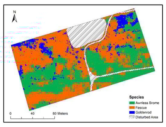Species classification map is shown in Figure 7. Clear spatial variations of species can be observed from the map. For example, Goldenrod plants are mainly seen in the north-western and north-eastern corners of the mapped area, Awnless Brome plants are mostly in the central part from west to east, and Fescue plants are in the other areas.