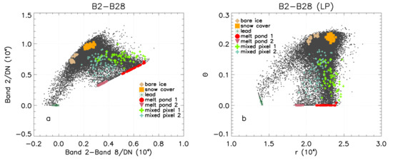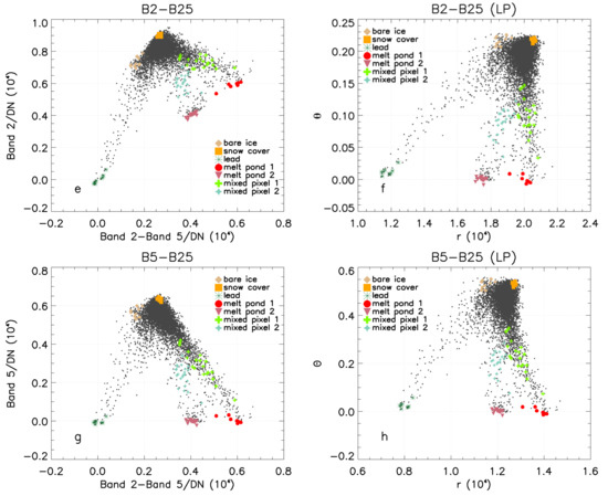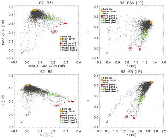 Subsequently, the scatterplots of these four combinations were obtained and then transformed into polar coordinates (Figure 5). To be consistent with Figure 3, the DN value is still used to obtain the scatterplots in Figure 5. For B2–B34, the melt pond clusters cannot be regarded as a line, and the lead cluster span is too large to remove. The point distributions of the other three combinations except B2–B34 are all reasonable: sea ice/snow points and all melt pond points are consistent in a straight line, and only the distance between the two axes varies.
