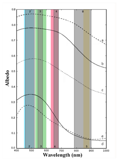 Spectral albedos for different surface types on Arctic sea ice (the values are from [20]): (a) snow-covered ice; (b) cold bare ice; (c) melting bare ice; (d) young melt pond; and (e) mature melt pond. The colored columns except the purple columns display the L8 bands used, and the band numbers are at the top of the columns. The colored columns display the S2 bands used, and the band numbers are in the top of the columns. The dark-gray columns represent the corresponding L7 bands, and the band numbers are at the bottom of the columns.