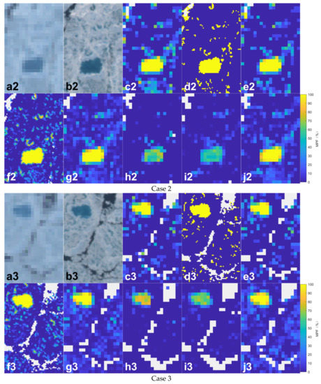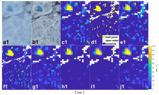The classification data of the SVM and ISODATA algorithms are shown in Figure 6(c1–c5) (the interpolation of the S2 classification data by the SVM algorithm) and Figure 6(e1–e5) (the interpolation of the S2 classification data by the ISODATA algorithm, Figure 6d1–d5). The MPF retrieval data of S2 using the LinearPolar algorithm are shown in Figure 6(f1–f5), and Figure 6(g1–g5) shows the interpolation of Figure 6(f1–f5) onto the L8 grid. The distribution of the three algorithms (the SVM algorithm, the ISODATA algorithm, and the LinearPolar algorithm) data are approximate. They can identify the 100% dark-blue melt ponds (cases 2, 3, and 4) and light-blue melt ponds (cases 1 and 5).