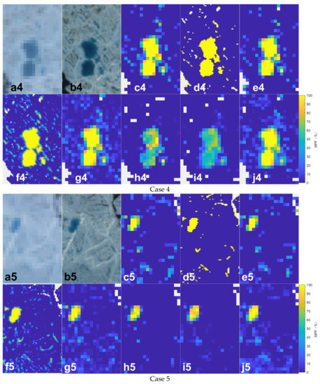 Figure 6 shows the retrieval results of five cases, which have obvious melt ponds, randomly selected from the coincidence part of scene D (L8) and scene f (S2) in Figure 1. For the retrieval results of L8 using the LinearPolar algorithm, these three MPFs of S2, SVM, and ISODATA are used to verify and compare.