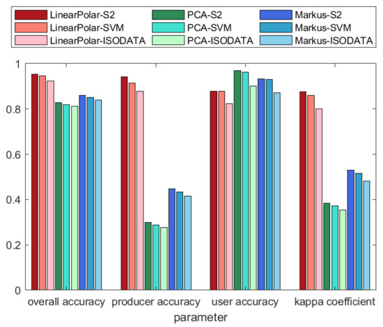 Accuracy of the classification data using 3 algorithms. L8 represents the retrieval result of L8 using the LinearPolar algorithm, PCA represents the retrieval result of L8 using the PCA algorithm, Markus represents the retrieval result of L8 using the Markus algorithm, S2 represents the retrieval result of S2 using the LinearPolar algorithm, SVM represents the classification result of S2 using the SVM algorithm, and ISODATA represents the classification result of S2 using the ISODATA algorithm. A-B represents the accuracy of the results of A, which takes B as the true category.