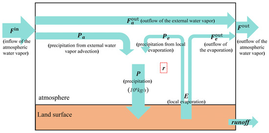 The atmospheric water vapor in an area can be divided into two types, namely, the water vapor content caused by external WVT () and the water vapor content formed by local land surface evapotranspiration (). Assuming that the water vapor formed by evapotranspiration is fully mixed in the local atmosphere, and the two have the same chance of forming precipitation, thus and . and are the precipitation caused by external WVT and local evapotranspiration, respectively. The water vapor balance equation of the external WVT term is as follows: