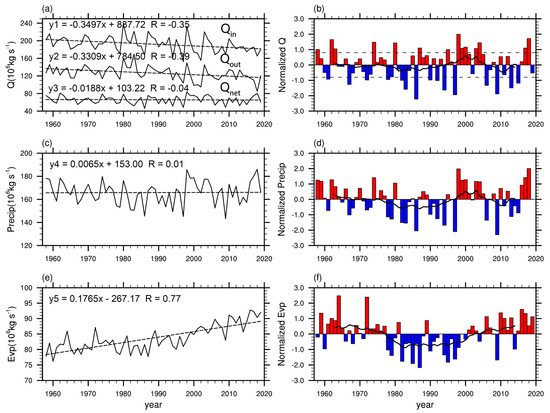 Time series of summer atmospheric water cycle elements on the TP from 1958 to 2019; the left column is the instantaneous value of the climatic state (unit: 106 kg s−1); the right column is the detrend standardized time series and the 11−year moving average. Among them: (a,b) the WVBs, (c,d) precipitations, (e,f) evapotranspirations. The black dashed lines indicate linear trend in (a,c,e).