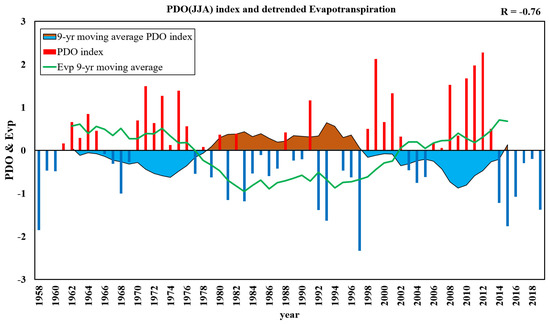 Time series of the evapotranspiration in the TP, and the PDO index during the period of 1958 to 2019.